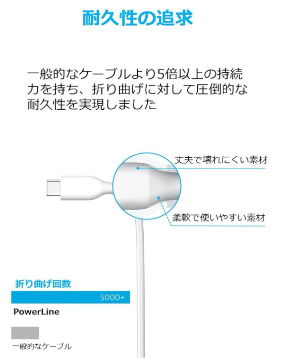 ・高い耐久性:高耐久素材を採用し、一般的なケーブルより5倍以上長持ちします。また安全性と信頼性の向上のため、56Kオームのプルアップレジスターを採用しました。