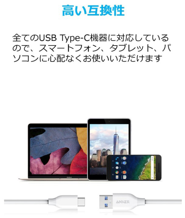 ・パッケージ内容:Anker PowerLine USB-C & USB-A 3.0 ケーブル(0.9m ホワイト)、カスタマーサポート