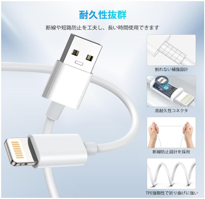 【優れた耐久性】耐久性を向上させ、ほつれを軽減するために、ライトニングおよびUSB側先端に保護層を追加しました。外部は厳選された優れたTPE素材によって覆われ、柔軟性がよく耐久性に優れます。8000回以上の折り曲げテストに合格しており、内部の無酸素銅、アルミ箔なども劣化しづらく耐磨耗性に優れています。コネクタの根元部分も耐久性に優れた造りで、断線しにくい丈夫なつくりのiPhone充電ケーブルです。